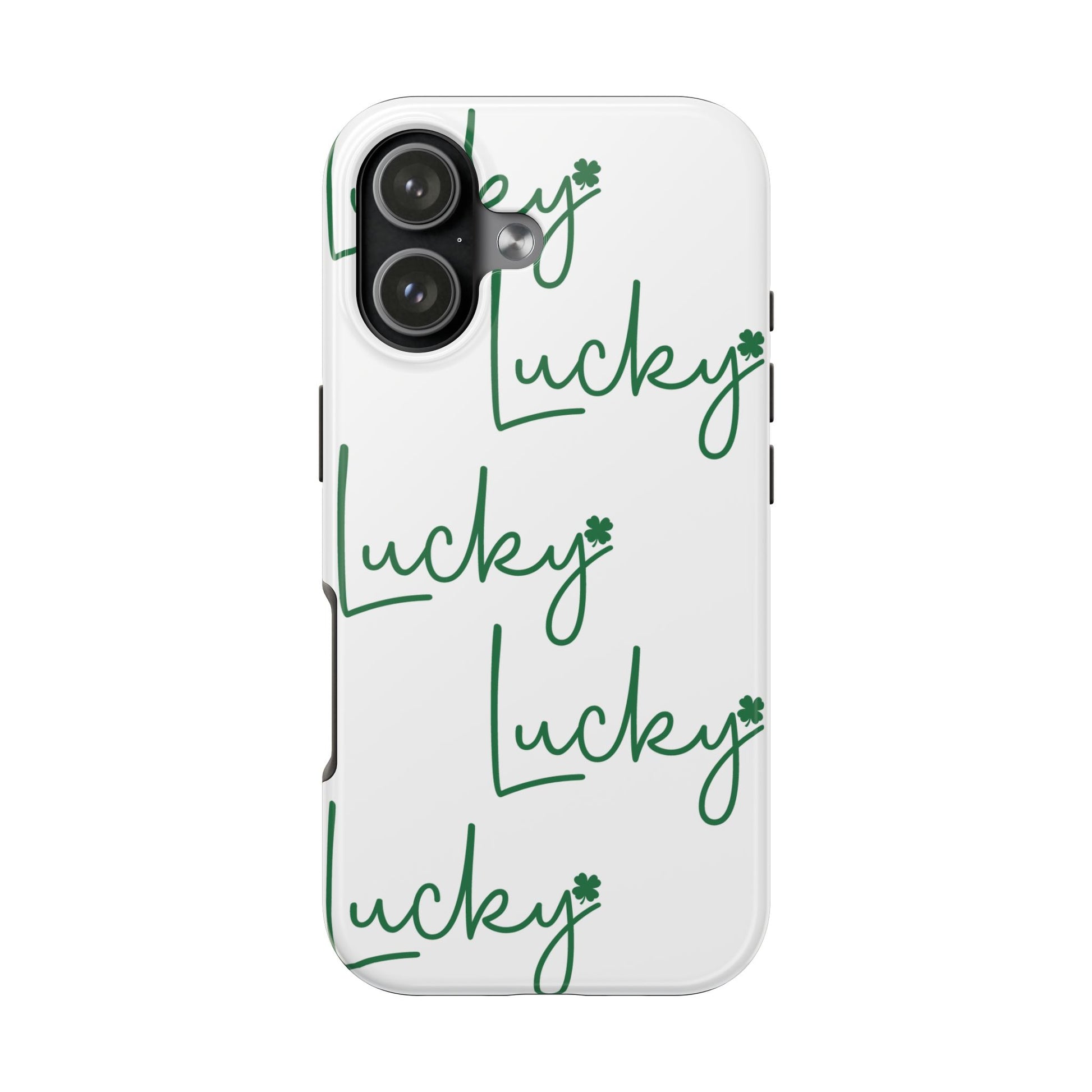 Embrace your Irish luck with our Lucky-Phone Case! This white case features the word LUCKY in green. Protects your phone with style (and a pinch of shamrock magic). Compatible with iPhone. Don't push your luck, get yours today!